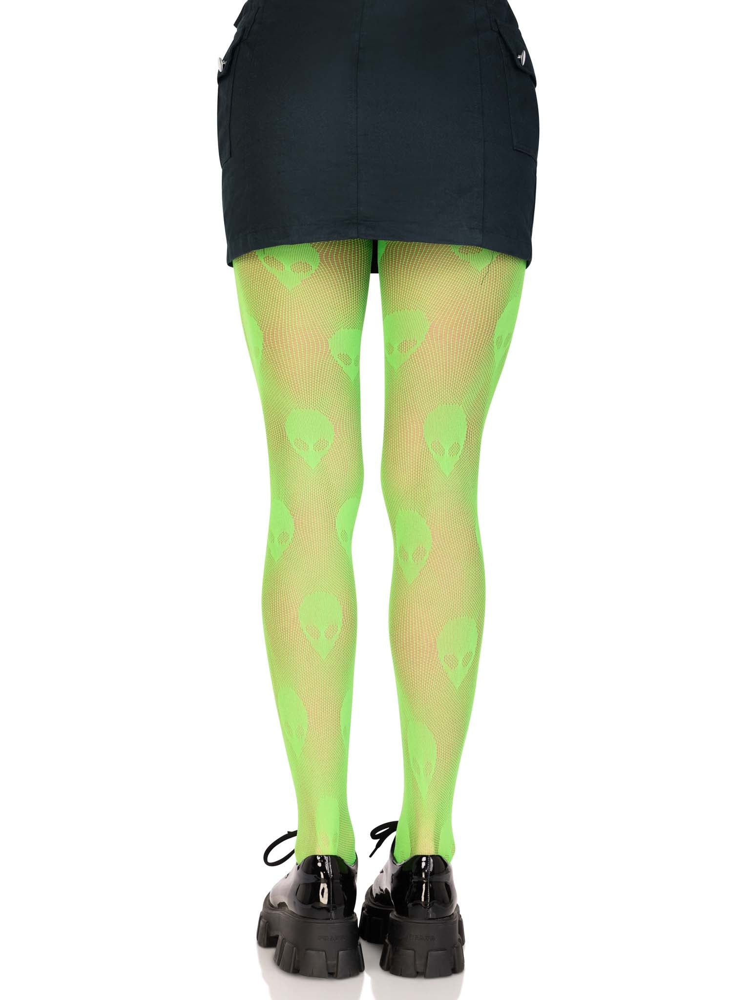 Beam up to these ultra- cute alien net tights by Leg Avenue. The out of this world vivid neon fishnets with woven alien head pattern are perfect for rave outfits, festival clothing, Halloween costumes, or everyday fun!