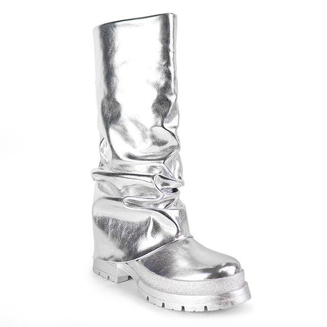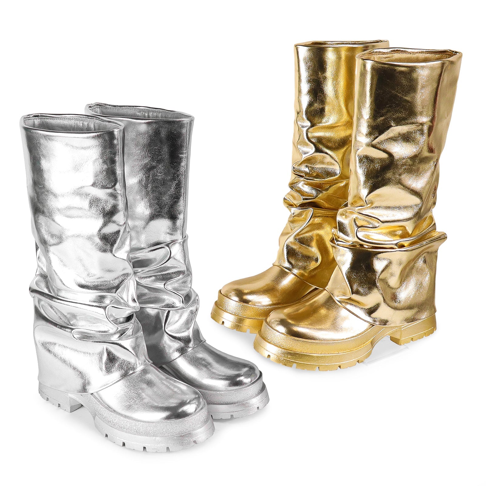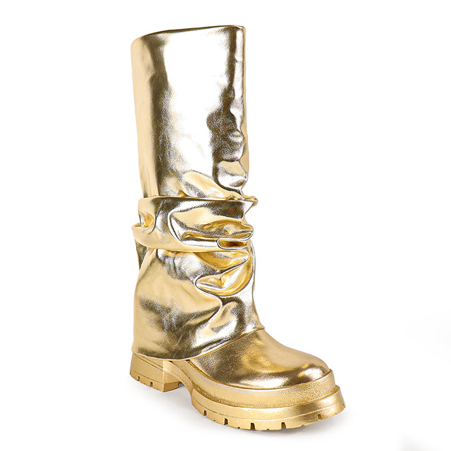 Introducing Dizzo-1, the perfect boots for any fashionista! With stylish rubber soles and a fold-over scrunch design, these boots will elevate any outfit. The metallic finish adds a touch of glamour to your look. Step out in style with these fold over boots. Order your Dizzo-1 in Silver and/or Gold Today!