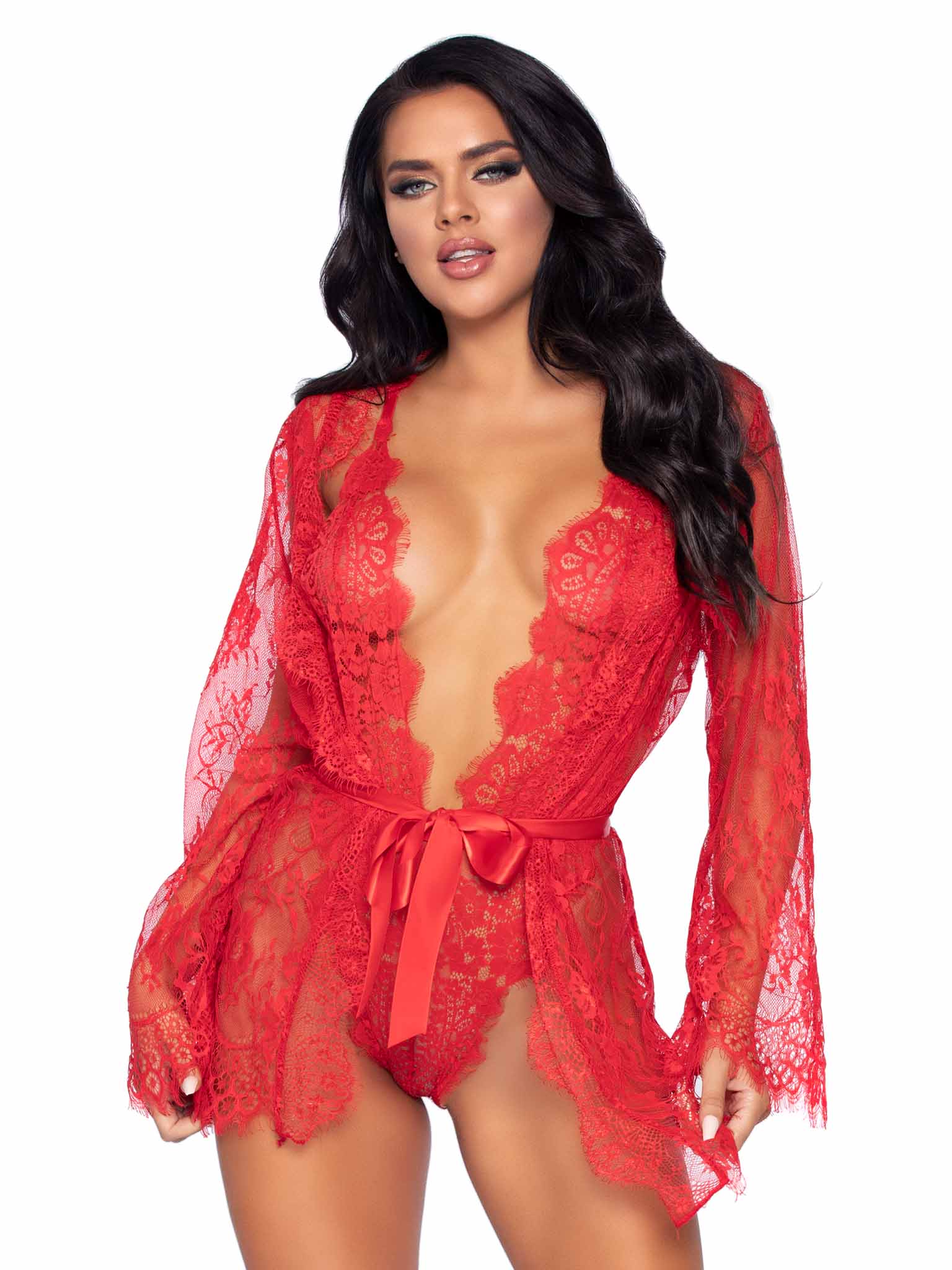 Get lost in the romance of this gorgeous 3 PC lingerie teddy and lace robe set by Leg Avenue. The flirty lingerie set features a plunging bodysuit teddy with adjustable straps and thong panty, lace short robe with scalloped trim, and satin ribbon tie closure.