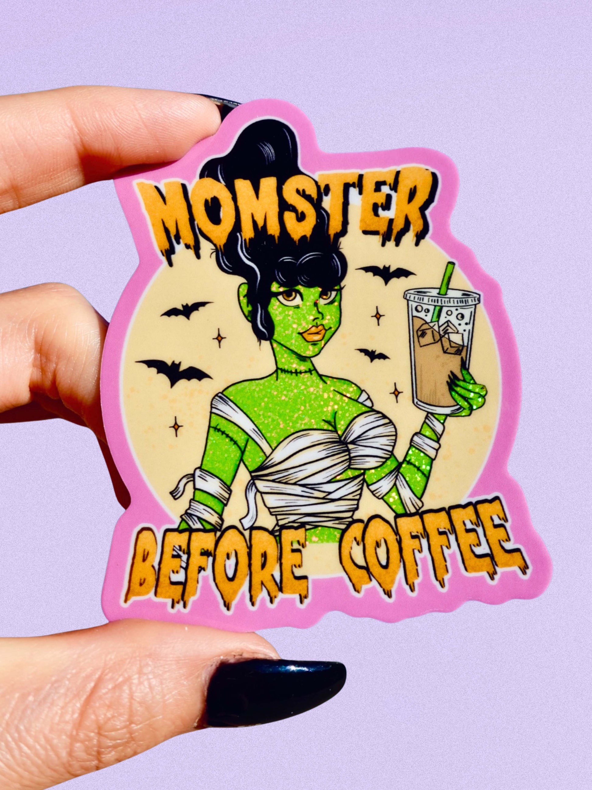 Fuel your spooky side with this glittery Momster Before Coffee sticker ☕👻. Featuring a green monster mom wrapped in mummy bandages, bats flying behind her, and a much-needed iced coffee in hand, this design screams horror glam and caffeine chaos. It’s the perfect mix of retro Halloween vibes and everyday mom humor.