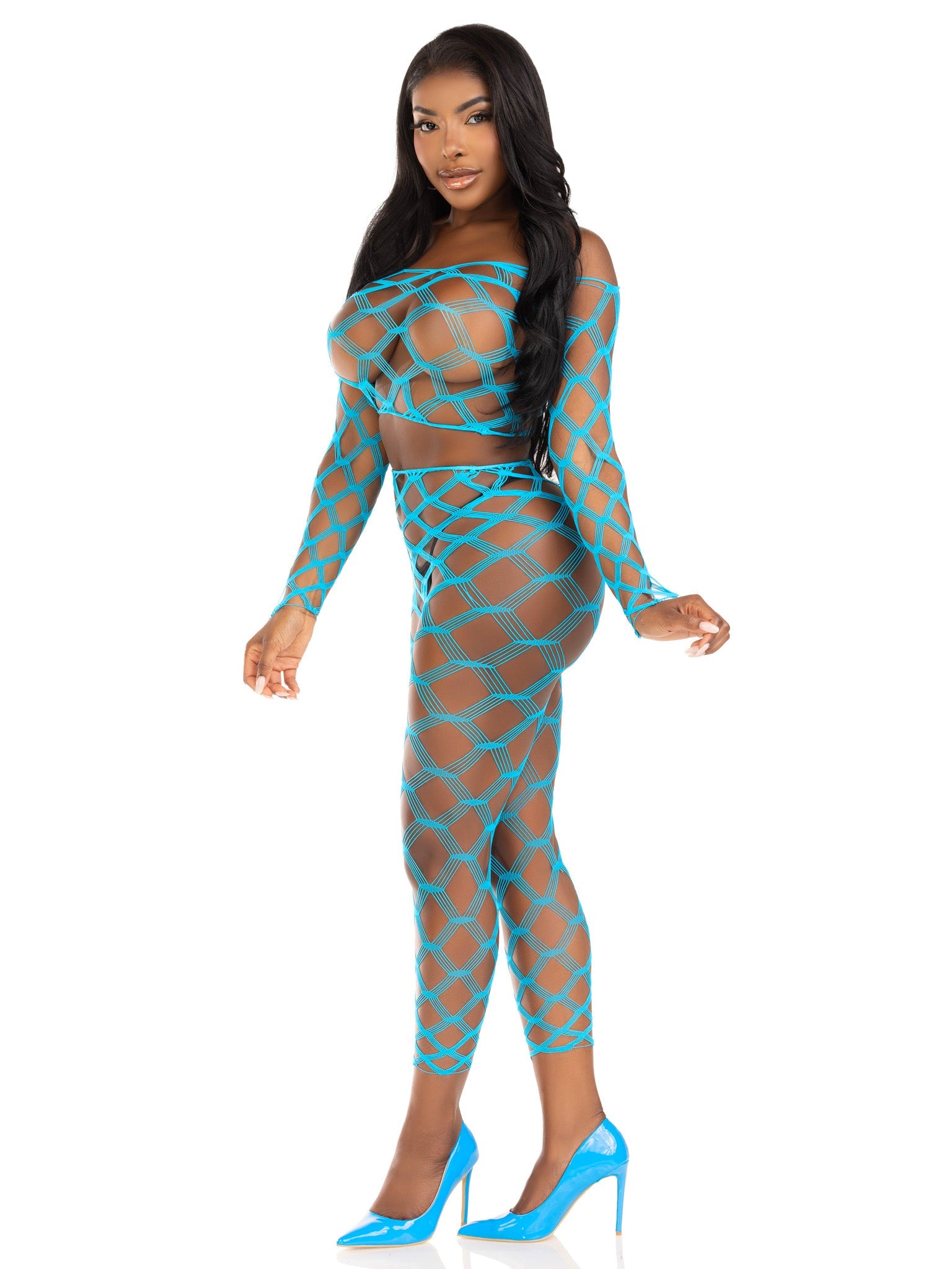 Get pulses racing in this ultra hot 2 piece net crop top and leggings set by Leg Avenue. The jaw-dropping long-sleeved crop top and footless tights feature a geometric net that’s destined to turn heads. Daring and versatile, this sexy lingerie look is sure to heat things up in the bedroom or take it poolside as a flirty swimsuit coverup. Bikini not included.