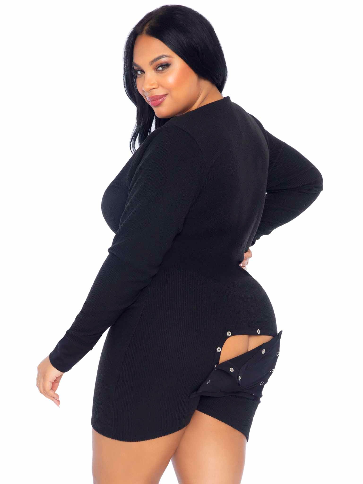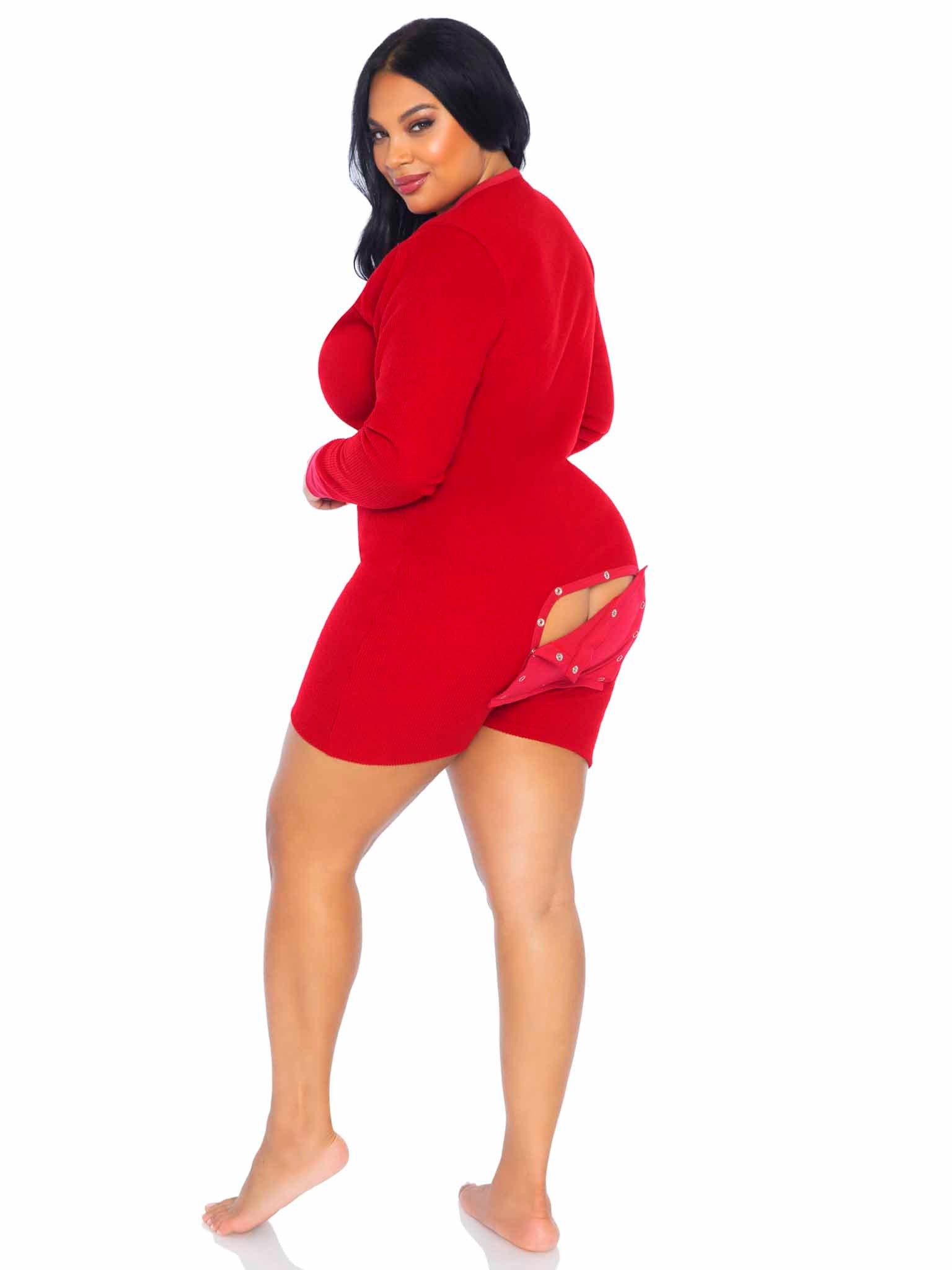 Cozy up with these ultra-comfy plus size long johns romper by Leg Avenue. The perfect alternative to boring plus size pajamas, this must-have loungewear look features ultra-soft brushed rib fabric with a naughty deep-v front and cheeky snap closure back flap.