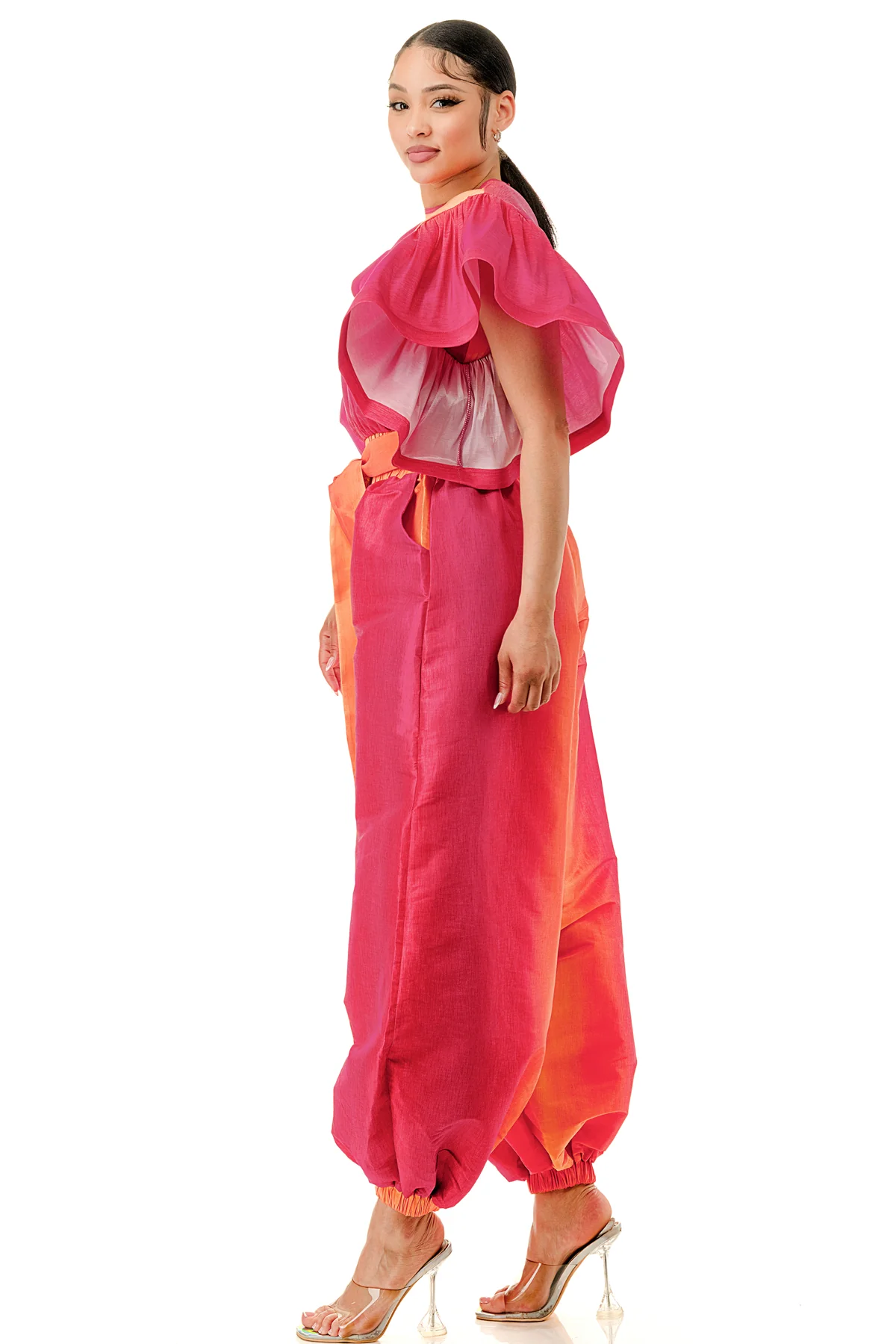 This stylish Tie Dye Waist Tie Ruffle Short Sleeve Elastic Waistband Top & Pants Two-Piece Set is made with stretch taffeta for maximum comfort and style. The oversized pants with elastic bottoms offer a relaxed fit, while the top's zipper closure and self-tie waistband ensure a flattering silhouette. This Two-Piece Set is Perfect for any occasion.